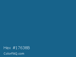 Hex #17638b Color is a normal blue color and the nearest color is Blue Sapphire #126180. Hex code #17638b and RGB value is rgb(23,99,139). In RGB color space, this color is composed of 9% red, 39% green, 55% blue, In CMYK color space, this color is composed of 83% cyan, 29% magenta, 0% yellow , 45% black , In HSL color space, this color has a hue angle of 201° , 72% saturation and 32% lightness.