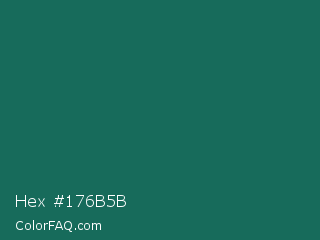 Hex #176b5b Color is a dark cyan color and the nearest color is Genoa #15736b. Hex code #176b5b and RGB value is rgb(23,107,91). In RGB color space, this color is composed of 9% red, 42% green, 36% blue, In CMYK color space, this color is composed of 79% cyan, 0% magenta, 15% yellow , 58% black , In HSL color space, this color has a hue angle of 169° , 65% saturation and 25% lightness.