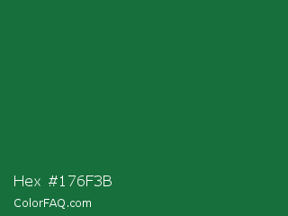 Hex #176f3b Color is a dark green color and the nearest color is Jewel #126b40. Hex code #176f3b and RGB value is rgb(23,111,59). In RGB color space, this color is composed of 9% red, 44% green, 23% blue, In CMYK color space, this color is composed of 79% cyan, 0% magenta, 47% yellow , 56% black , In HSL color space, this color has a hue angle of 145° , 66% saturation and 26% lightness.