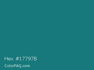 Hex #17797b Color is a dark cyan color and the nearest color is Elm #1c7c7d. Hex code #17797b and RGB value is rgb(23,121,123). In RGB color space, this color is composed of 9% red, 47% green, 48% blue, In CMYK color space, this color is composed of 81% cyan, 2% magenta, 0% yellow , 52% black , In HSL color space, this color has a hue angle of 181° , 68% saturation and 29% lightness.