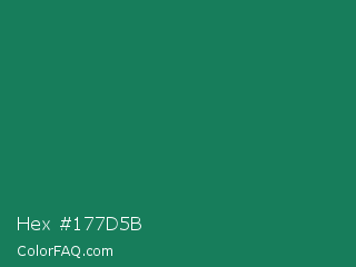 Hex #177d5b Color is a dark green color and the nearest color is Deep Green Cyan Turquoise #0e7c61. Hex code #177d5b and RGB value is rgb(23,125,91). In RGB color space, this color is composed of 9% red, 49% green, 36% blue, In CMYK color space, this color is composed of 82% cyan, 0% magenta, 27% yellow , 51% black , In HSL color space, this color has a hue angle of 160° , 69% saturation and 29% lightness.