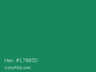 Hex #17885d Color is a normal green color and the nearest color is Deep Green Cyan Turquoise #0e7c61. Hex code #17885d and RGB value is rgb(23,136,93). In RGB color space, this color is composed of 9% red, 53% green, 36% blue, In CMYK color space, this color is composed of 83% cyan, 0% magenta, 32% yellow , 47% black , In HSL color space, this color has a hue angle of 157° , 71% saturation and 31% lightness.