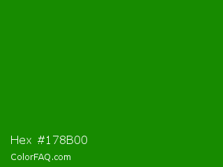 Hex #178b00 Color is a dark green color and the nearest color is India Green #138808. Hex code #178b00 and RGB value is rgb(23,139,0). In RGB color space, this color is composed of 9% red, 55% green, 0% blue, In CMYK color space, this color is composed of 83% cyan, 0% magenta, 100% yellow , 45% black , In HSL color space, this color has a hue angle of 110° , 100% saturation and 27% lightness.
