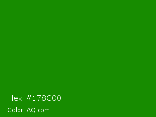 Hex #178c00 Color is a dark green color and the nearest color is India Green #138808. Hex code #178c00 and RGB value is rgb(23,140,0). In RGB color space, this color is composed of 9% red, 55% green, 0% blue, In CMYK color space, this color is composed of 84% cyan, 0% magenta, 100% yellow , 45% black , In HSL color space, this color has a hue angle of 110° , 100% saturation and 27% lightness.