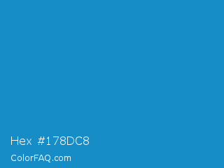 Hex #178dc8 Color is a normal blue color and the nearest color is Cyan Cornflower Blue #188bc2. Hex code #178dc8 and RGB value is rgb(23,141,200). In RGB color space, this color is composed of 9% red, 55% green, 78% blue, In CMYK color space, this color is composed of 89% cyan, 30% magenta, 0% yellow , 22% black , In HSL color space, this color has a hue angle of 200° , 79% saturation and 44% lightness.