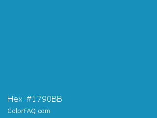 Hex #1790bb Color is a normal blue color and the nearest color is Cyan Cornflower Blue #188bc2. Hex code #1790bb and RGB value is rgb(23,144,187). In RGB color space, this color is composed of 9% red, 56% green, 73% blue, In CMYK color space, this color is composed of 88% cyan, 23% magenta, 0% yellow , 27% black , In HSL color space, this color has a hue angle of 196° , 78% saturation and 41% lightness.