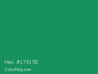 Hex #17915e Color is a normal green color and the nearest color is Eucalyptus #278a5b. Hex code #17915e and RGB value is rgb(23,145,94). In RGB color space, this color is composed of 9% red, 57% green, 37% blue, In CMYK color space, this color is composed of 84% cyan, 0% magenta, 35% yellow , 43% black , In HSL color space, this color has a hue angle of 155° , 73% saturation and 33% lightness.