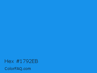 Hex #1792eb Color is a normal blue color and the nearest color is Button Blue #24a0ed. Hex code #1792eb and RGB value is rgb(23,146,235). In RGB color space, this color is composed of 9% red, 57% green, 92% blue, In CMYK color space, this color is composed of 90% cyan, 38% magenta, 0% yellow , 8% black , In HSL color space, this color has a hue angle of 205° , 84% saturation and 51% lightness.