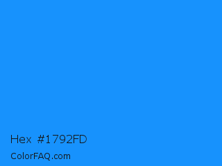 Hex #1792fd Color is a normal blue color and the nearest color is Dodger Blue #1e90ff. Hex code #1792fd and RGB value is rgb(23,146,253). In RGB color space, this color is composed of 9% red, 57% green, 99% blue, In CMYK color space, this color is composed of 91% cyan, 42% magenta, 0% yellow , 1% black , In HSL color space, this color has a hue angle of 208° , 98% saturation and 54% lightness.