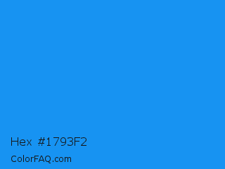 Hex #1793f2 Color is a normal blue color and the nearest color is Dodger Blue #1e90ff. Hex code #1793f2 and RGB value is rgb(23,147,242). In RGB color space, this color is composed of 9% red, 58% green, 95% blue, In CMYK color space, this color is composed of 90% cyan, 39% magenta, 0% yellow , 5% black , In HSL color space, this color has a hue angle of 206° , 89% saturation and 52% lightness.