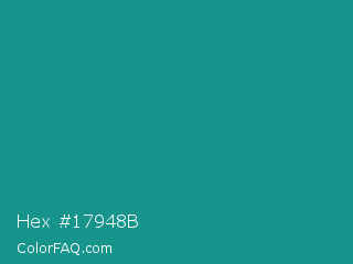 Hex #17948b Color is a normal cyan color and the nearest color is Blue Chill #0c8990. Hex code #17948b and RGB value is rgb(23,148,139). In RGB color space, this color is composed of 9% red, 58% green, 55% blue, In CMYK color space, this color is composed of 84% cyan, 0% magenta, 6% yellow , 42% black , In HSL color space, this color has a hue angle of 176° , 73% saturation and 34% lightness.
