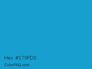 Hex #179fd0 Color is a normal blue color and the nearest color is Pacific Blue #1ca9c9. Hex code #179fd0 and RGB value is rgb(23,159,208). In RGB color space, this color is composed of 9% red, 62% green, 82% blue, In CMYK color space, this color is composed of 89% cyan, 24% magenta, 0% yellow , 18% black , In HSL color space, this color has a hue angle of 196° , 80% saturation and 45% lightness.