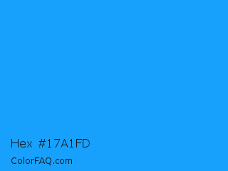 Hex #17a1fd Color is a normal blue color and the nearest color is Dodger Blue #1e90ff. Hex code #17a1fd and RGB value is rgb(23,161,253). In RGB color space, this color is composed of 9% red, 63% green, 99% blue, In CMYK color space, this color is composed of 91% cyan, 36% magenta, 0% yellow , 1% black , In HSL color space, this color has a hue angle of 204° , 98% saturation and 54% lightness.