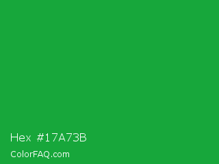 Hex #17a73b Color is a normal green color and the nearest color is Green Pantone #00ad43. Hex code #17a73b and RGB value is rgb(23,167,59). In RGB color space, this color is composed of 9% red, 65% green, 23% blue, In CMYK color space, this color is composed of 86% cyan, 0% magenta, 65% yellow , 35% black , In HSL color space, this color has a hue angle of 135° , 76% saturation and 37% lightness.