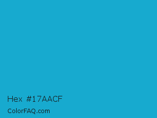 Hex #17aacf Color is a normal cyan color and the nearest color is Pacific Blue #1ca9c9. Hex code #17aacf and RGB value is rgb(23,170,207). In RGB color space, this color is composed of 9% red, 67% green, 81% blue, In CMYK color space, this color is composed of 89% cyan, 18% magenta, 0% yellow , 19% black , In HSL color space, this color has a hue angle of 192° , 80% saturation and 45% lightness.