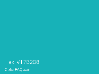 Hex #17b2b8 Color is a normal cyan color and the nearest color is Tiffany Blue #0abab5. Hex code #17b2b8 and RGB value is rgb(23,178,184). In RGB color space, this color is composed of 9% red, 70% green, 72% blue, In CMYK color space, this color is composed of 88% cyan, 3% magenta, 0% yellow , 28% black , In HSL color space, this color has a hue angle of 182° , 78% saturation and 41% lightness.
