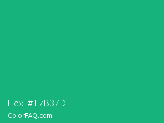 Hex #17b37d Color is a normal green color and the nearest color is Mountain Meadow Crayola #1ab385. Hex code #17b37d and RGB value is rgb(23,179,125). In RGB color space, this color is composed of 9% red, 70% green, 49% blue, In CMYK color space, this color is composed of 87% cyan, 0% magenta, 30% yellow , 30% black , In HSL color space, this color has a hue angle of 159° , 77% saturation and 40% lightness.