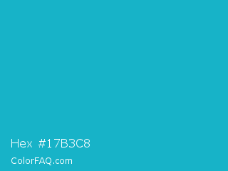 Hex #17b3c8 Color is a normal cyan color and the nearest color is Pacific Blue #1ca9c9. Hex code #17b3c8 and RGB value is rgb(23,179,200). In RGB color space, this color is composed of 9% red, 70% green, 78% blue, In CMYK color space, this color is composed of 89% cyan, 11% magenta, 0% yellow , 22% black , In HSL color space, this color has a hue angle of 187° , 79% saturation and 44% lightness.