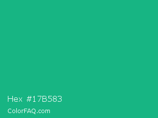 Hex #17b583 Color is a normal green color and the nearest color is Mountain Meadow Crayola #1ab385. Hex code #17b583 and RGB value is rgb(23,181,131). In RGB color space, this color is composed of 9% red, 71% green, 51% blue, In CMYK color space, this color is composed of 87% cyan, 0% magenta, 28% yellow , 29% black , In HSL color space, this color has a hue angle of 161° , 77% saturation and 40% lightness.