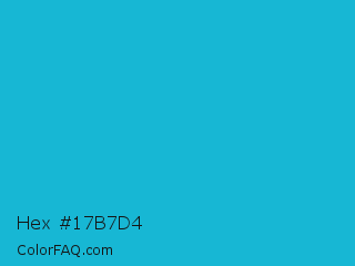 Hex #17b7d4 Color is a normal cyan color and the nearest color is Battery Charged Blue #1dacd6. Hex code #17b7d4 and RGB value is rgb(23,183,212). In RGB color space, this color is composed of 9% red, 72% green, 83% blue, In CMYK color space, this color is composed of 89% cyan, 14% magenta, 0% yellow , 17% black , In HSL color space, this color has a hue angle of 189° , 80% saturation and 46% lightness.