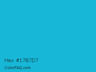 Hex #17b7d7 Color is a normal cyan color and the nearest color is Battery Charged Blue #1dacd6. Hex code #17b7d7 and RGB value is rgb(23,183,215). In RGB color space, this color is composed of 9% red, 72% green, 84% blue, In CMYK color space, this color is composed of 89% cyan, 15% magenta, 0% yellow , 16% black , In HSL color space, this color has a hue angle of 190° , 81% saturation and 47% lightness.