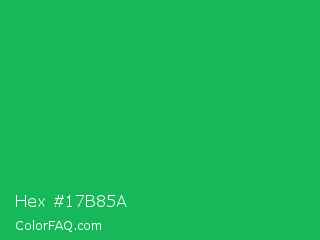 Hex #17b85a Color is a normal green color and the nearest color is GO Green #00ab66. Hex code #17b85a and RGB value is rgb(23,184,90). In RGB color space, this color is composed of 9% red, 72% green, 35% blue, In CMYK color space, this color is composed of 88% cyan, 0% magenta, 51% yellow , 28% black , In HSL color space, this color has a hue angle of 145° , 78% saturation and 41% lightness.