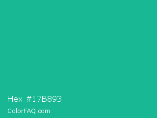 Hex #17b893 Color is a normal cyan color and the nearest color is Mountain Meadow Crayola #1ab385. Hex code #17b893 and RGB value is rgb(23,184,147). In RGB color space, this color is composed of 9% red, 72% green, 58% blue, In CMYK color space, this color is composed of 88% cyan, 0% magenta, 20% yellow , 28% black , In HSL color space, this color has a hue angle of 166° , 78% saturation and 41% lightness.