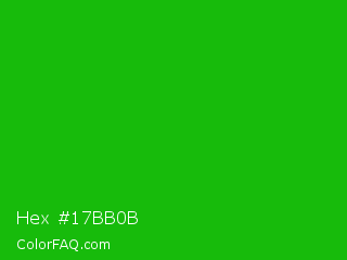 Hex #17bb0b Color is a normal green color and the nearest color is Slimy Green #299617. Hex code #17bb0b and RGB value is rgb(23,187,11). In RGB color space, this color is composed of 9% red, 73% green, 4% blue, In CMYK color space, this color is composed of 88% cyan, 0% magenta, 94% yellow , 27% black , In HSL color space, this color has a hue angle of 116° , 89% saturation and 39% lightness.