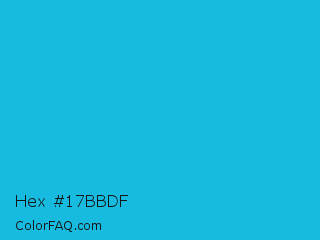 Hex #17bbdf Color is a normal cyan color and the nearest color is Battery Charged Blue #1dacd6. Hex code #17bbdf and RGB value is rgb(23,187,223). In RGB color space, this color is composed of 9% red, 73% green, 87% blue, In CMYK color space, this color is composed of 90% cyan, 16% magenta, 0% yellow , 13% black , In HSL color space, this color has a hue angle of 191° , 81% saturation and 48% lightness.