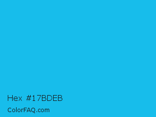 Hex #17bdeb Color is a normal cyan color and the nearest color is Spiro Disco Ball #0fc0fc. Hex code #17bdeb and RGB value is rgb(23,189,235). In RGB color space, this color is composed of 9% red, 74% green, 92% blue, In CMYK color space, this color is composed of 90% cyan, 20% magenta, 0% yellow , 8% black , In HSL color space, this color has a hue angle of 193° , 84% saturation and 51% lightness.