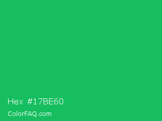Hex #17be60 Color is a normal green color and the nearest color is Green Crayola #1cac78. Hex code #17be60 and RGB value is rgb(23,190,96). In RGB color space, this color is composed of 9% red, 75% green, 38% blue, In CMYK color space, this color is composed of 88% cyan, 0% magenta, 49% yellow , 25% black , In HSL color space, this color has a hue angle of 146° , 78% saturation and 42% lightness.