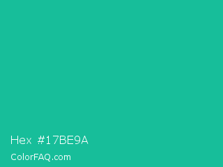 Hex #17be9a Color is a normal cyan color and the nearest color is Light Sea Green #20b2aa. Hex code #17be9a and RGB value is rgb(23,190,154). In RGB color space, this color is composed of 9% red, 75% green, 60% blue, In CMYK color space, this color is composed of 88% cyan, 0% magenta, 19% yellow , 25% black , In HSL color space, this color has a hue angle of 167° , 78% saturation and 42% lightness.