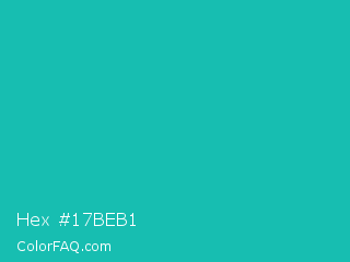 Hex #17beb1 Color is a normal cyan color and the nearest color is Tiffany Blue #0abab5. Hex code #17beb1 and RGB value is rgb(23,190,177). In RGB color space, this color is composed of 9% red, 75% green, 69% blue, In CMYK color space, this color is composed of 88% cyan, 0% magenta, 7% yellow , 25% black , In HSL color space, this color has a hue angle of 175° , 78% saturation and 42% lightness.