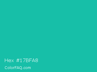 Hex #17bfa8 Color is a normal cyan color and the nearest color is Light Sea Green #20b2aa. Hex code #17bfa8 and RGB value is rgb(23,191,168). In RGB color space, this color is composed of 9% red, 75% green, 66% blue, In CMYK color space, this color is composed of 88% cyan, 0% magenta, 12% yellow , 25% black , In HSL color space, this color has a hue angle of 172° , 79% saturation and 42% lightness.