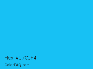 Hex #17c1f4 Color is a normal blue color and the nearest color is Spiro Disco Ball #0fc0fc. Hex code #17c1f4 and RGB value is rgb(23,193,244). In RGB color space, this color is composed of 9% red, 76% green, 96% blue, In CMYK color space, this color is composed of 91% cyan, 21% magenta, 0% yellow , 4% black , In HSL color space, this color has a hue angle of 194° , 91% saturation and 52% lightness.