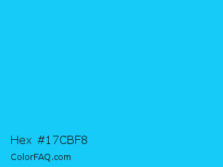 Hex #17cbf8 Color is a normal cyan color and the nearest color is Spiro Disco Ball #0fc0fc. Hex code #17cbf8 and RGB value is rgb(23,203,248). In RGB color space, this color is composed of 9% red, 80% green, 97% blue, In CMYK color space, this color is composed of 91% cyan, 18% magenta, 0% yellow , 3% black , In HSL color space, this color has a hue angle of 192° , 94% saturation and 53% lightness.