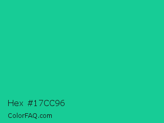 Hex #17cc96 Color is a normal green color and the nearest color is Caribbean Green #00cc99. Hex code #17cc96 and RGB value is rgb(23,204,150). In RGB color space, this color is composed of 9% red, 80% green, 59% blue, In CMYK color space, this color is composed of 89% cyan, 0% magenta, 26% yellow , 20% black , In HSL color space, this color has a hue angle of 162° , 80% saturation and 45% lightness.