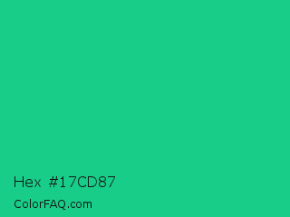 Hex #17cd87 Color is a normal green color and the nearest color is Mountain Meadow Crayola #1ab385. Hex code #17cd87 and RGB value is rgb(23,205,135). In RGB color space, this color is composed of 9% red, 80% green, 53% blue, In CMYK color space, this color is composed of 89% cyan, 0% magenta, 34% yellow , 20% black , In HSL color space, this color has a hue angle of 157° , 80% saturation and 45% lightness.