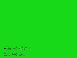 Hex #17d717 Color is a normal green color and the nearest color is Vivid Malachite #00cc33. Hex code #17d717 and RGB value is rgb(23,215,23). In RGB color space, this color is composed of 9% red, 84% green, 9% blue, In CMYK color space, this color is composed of 89% cyan, 0% magenta, 89% yellow , 16% black , In HSL color space, this color has a hue angle of 120° , 81% saturation and 47% lightness.