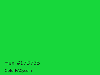 Hex #17d73b Color is a normal green color and the nearest color is Malachite #0bda51. Hex code #17d73b and RGB value is rgb(23,215,59). In RGB color space, this color is composed of 9% red, 84% green, 23% blue, In CMYK color space, this color is composed of 89% cyan, 0% magenta, 73% yellow , 16% black , In HSL color space, this color has a hue angle of 131° , 81% saturation and 47% lightness.