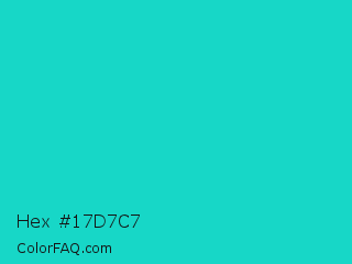 Hex #17d7c7 Color is a normal cyan color and the nearest color is Java #1fc2c2. Hex code #17d7c7 and RGB value is rgb(23,215,199). In RGB color space, this color is composed of 9% red, 84% green, 78% blue, In CMYK color space, this color is composed of 89% cyan, 0% magenta, 7% yellow , 16% black , In HSL color space, this color has a hue angle of 175° , 81% saturation and 47% lightness.