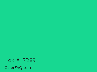 Hex #17d891 Color is a normal green color and the nearest color is Caribbean Green #00cc99. Hex code #17d891 and RGB value is rgb(23,216,145). In RGB color space, this color is composed of 9% red, 85% green, 57% blue, In CMYK color space, this color is composed of 89% cyan, 0% magenta, 33% yellow , 15% black , In HSL color space, this color has a hue angle of 158° , 81% saturation and 47% lightness.