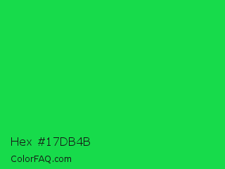 Hex #17db4b Color is a normal green color and the nearest color is Malachite #0bda51. Hex code #17db4b and RGB value is rgb(23,219,75). In RGB color space, this color is composed of 9% red, 86% green, 29% blue, In CMYK color space, this color is composed of 89% cyan, 0% magenta, 66% yellow , 14% black , In HSL color space, this color has a hue angle of 136° , 81% saturation and 47% lightness.