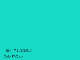Hex #17dbc7 Color is a normal cyan color and the nearest color is Turquoise PWG #30d5c8. Hex code #17dbc7 and RGB value is rgb(23,219,199). In RGB color space, this color is composed of 9% red, 86% green, 78% blue, In CMYK color space, this color is composed of 89% cyan, 0% magenta, 9% yellow , 14% black , In HSL color space, this color has a hue angle of 174° , 81% saturation and 47% lightness.