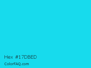 Hex #17dbed Color is a normal cyan color and the nearest color is Bright Turquoise #08e8de. Hex code #17dbed and RGB value is rgb(23,219,237). In RGB color space, this color is composed of 9% red, 86% green, 93% blue, In CMYK color space, this color is composed of 90% cyan, 8% magenta, 0% yellow , 7% black , In HSL color space, this color has a hue angle of 185° , 86% saturation and 51% lightness.
