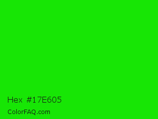 Hex #17e605 Color is a normal green color and the nearest color is Green #00ff00. Hex code #17e605 and RGB value is rgb(23,230,5). In RGB color space, this color is composed of 9% red, 90% green, 2% blue, In CMYK color space, this color is composed of 90% cyan, 0% magenta, 98% yellow , 10% black , In HSL color space, this color has a hue angle of 115° , 96% saturation and 46% lightness.