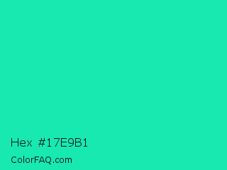 Hex #17e9b1 Color is a normal cyan color and the nearest color is Medium Spring Green #00fa9a. Hex code #17e9b1 and RGB value is rgb(23,233,177). In RGB color space, this color is composed of 9% red, 91% green, 69% blue, In CMYK color space, this color is composed of 90% cyan, 0% magenta, 24% yellow , 9% black , In HSL color space, this color has a hue angle of 164° , 83% saturation and 50% lightness.