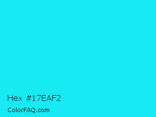 Hex #17eaf2 Color is a normal cyan color and the nearest color is Loeen #15f2fd. Hex code #17eaf2 and RGB value is rgb(23,234,242). In RGB color space, this color is composed of 9% red, 92% green, 95% blue, In CMYK color space, this color is composed of 90% cyan, 3% magenta, 0% yellow , 5% black , In HSL color space, this color has a hue angle of 182° , 89% saturation and 52% lightness.