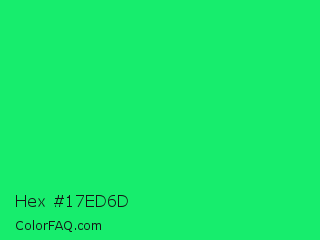 Hex #17ed6d Color is a normal green color and the nearest color is Spring Green #00ff7f. Hex code #17ed6d and RGB value is rgb(23,237,109). In RGB color space, this color is composed of 9% red, 93% green, 43% blue, In CMYK color space, this color is composed of 90% cyan, 0% magenta, 54% yellow , 7% black , In HSL color space, this color has a hue angle of 144° , 86% saturation and 51% lightness.
