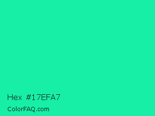 Hex #17efa7 Color is a normal green color and the nearest color is Medium Spring Green #00fa9a. Hex code #17efa7 and RGB value is rgb(23,239,167). In RGB color space, this color is composed of 9% red, 94% green, 65% blue, In CMYK color space, this color is composed of 90% cyan, 0% magenta, 30% yellow , 6% black , In HSL color space, this color has a hue angle of 160° , 87% saturation and 51% lightness.